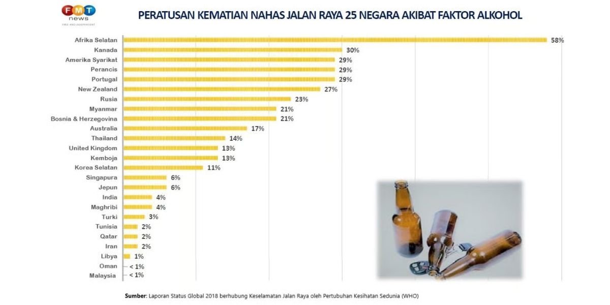 Malah, Laporan Status Global 2018 berhubung Keselamatan Jalan Raya oleh Pertubuhan Kesihatan Sedunia (WHO), menunjukkan Malaysia antara negara terendah dengan peratus kematian kemalangan akibat alkohol, iaitu kurang 1%. Peratus ini adalah lebih rendah berbanding negara-negara maju termasuk Singapura, Jepun, Korea Selatan, Kanada dan United Kingdom.